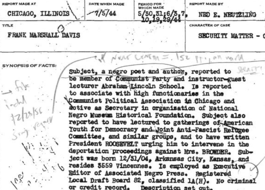 On December 5, 1956, Frank Marshall Davis appeared in executive session before the U.S. Senate subcommittee investigating 'the scope of Soviet activity in the United States. It was one of the McCarthy-era committees seeking to expose communist considered to be a security threat. A year earlier, in 1955, the Commission on Subversive Activities organized by the government of the territory of Hawaii identified Davis as a member of the Communist Party USA.